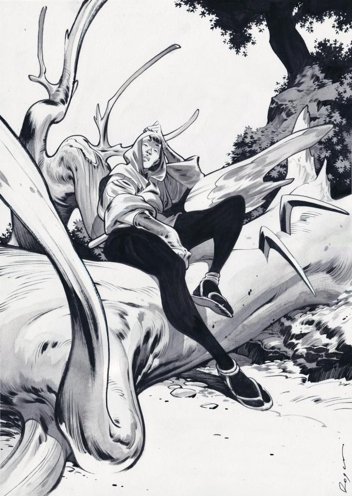 Ce qui m’a séduit en premier dans le projet de Fabien, c’était le fait que ce soit une histoire ancrée dans le genre de l’heroic fantasy. Je n’avais jamais eu l’opportunité d’aborder ce genre, bien qu’il ait toujours été l’un de mes préférés. Je partage avec Fabien ce goût, depuis ma jeunesse, pour des personnages mythiques comme Conan ou des lectures qui m’ont rendu très heureux quand j’étais petit, comme la série La Quête de l’oiseau du temps. Avec ces ingrédients, je savais que nous allions nous amuser, et j’étais intrigué de voir comment Fabien appliquerait ces différentes couches de lecture qu’il donne habituellement à ses histoires dans une histoire comme celle-ci.