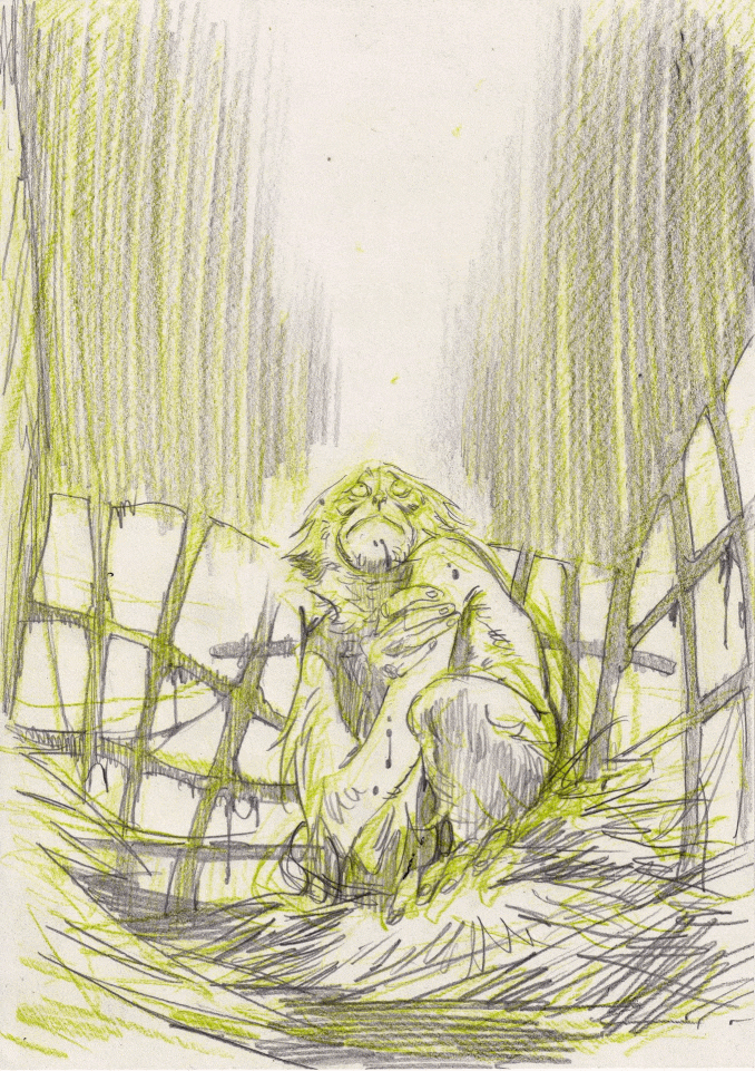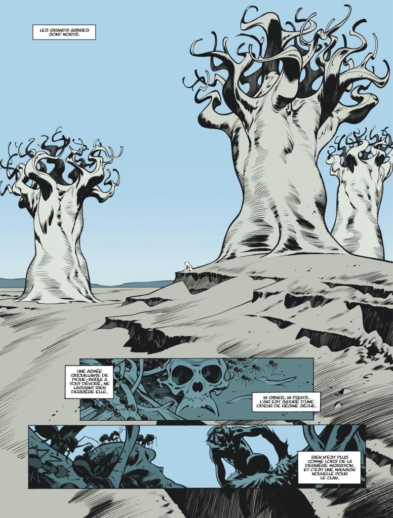 Alors pourquoi ces singes ? Ce que je mets dans le terme « heroic fantasy » —même s’il y a débat, beaucoup de gens disent que Le Dieu-Fauve n’est pas un album d’heroic fantasy—c’est un récit très primitif inspiré de Conan le barbare de Howard et un peu de La quête de l’oiseau du temps, même si cette dernière référence déjà plus dans le fantastique que dans l’héroic entendu au sens de ces combats primitifs entre barbares. J’associe aussi ces singes avec mon envie de parler de la fin d’une civilisation et le fait de revenir à des temps supposément primitifs, auxquels on associe le Déluge qui apparaît dans beaucoup de mythologies. C’est vers la fin que tout s’est cristallisé : mon envie de faire de l’heroic fantasy, l’arrivée des singes, Roger qui accepte et l’envie de parler de fins de civilisations très présentes dans mon esprit..