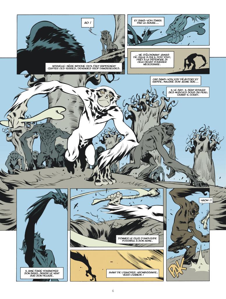 Des premières heures de l’humanité à la fin de la civilisation, les quatre protagonistes qui racontent cette histoire, vont dévoiler plusieurs facettes de la violence qui accompagne le règne animal. À travers le destin de Sans-voix, singe rescapé d’un massacre, devenu gladiateur, idole guerrière et dieu vengeur, on assiste à ce récit monde aussi philosophique qu’épique porté par la patte d’un dessinateur passé maître dans l’art de la dualité graphique, jouant aussi bien du clair-obscur que des angles & rondeurs.