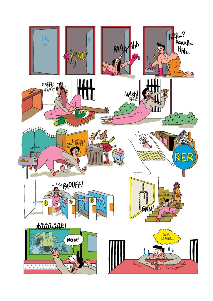 Avec son trait élastique et ses planches pleines de détails, on ne peut s’empêcher de faire un lien de parenté avec le travail d’Edika mais l’absurde de Gleason est autre. Elle a une fascination pour les corps en mouvements, les anatomies qui s’emparent de l’espace, les couleurs qui ont du caractère et les typographiques vivaces.