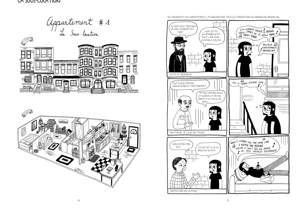 Puis les planches s’étoffent, elle publie dans la presse et sort des recueils de ses strips (disponibles en français dans un gros recueil de 500 pages, Le Musée de mes erreurs, avec en bonus ses toutes premières histoires). Puis elle se lance dans des albums plus ambitieux : Whiskey & New York, où elle évoque sa vie de jeune adulte arrivant à New York, entre déprime, solitude, déboires amoureux et premières addictions. L’attente infinie, où elle évoque sa maladie, son rapport aux livres et le début de sa carrière. Et Les imbuvables qui revient sur son alcoolisme, son combat contre les addictions, sa rupture amoureuse tragique et qui se termine sur une très belle déclaration d’amitié. Ajoutons, Les entrailles de New York, un carnet de voyage décalé pour découvrir New York qui prolonge les albums précédents et identifie les lieux clefs où évoluent les personnages et dévoilent toute l’étendue des envies graphiques de l’artiste.