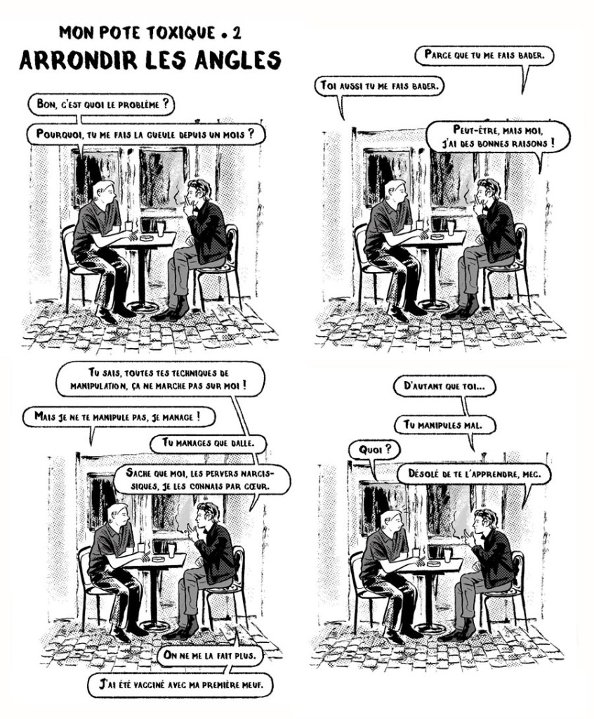 Le dessinateur qui sera lui-même au cœur de l’épilogue décalé « Je suis toxique » indique en avant-propos que la plupart des histoires proposées dans le livre sont issues de véritables témoignages ou d’observations. Et pour certaines, cette info à de l’importance tellement les situations sont ubuesques. Il explore la diversité des relations toxiques, que ce soit en amour ou famille, mais aussi en amitié, au boulot…