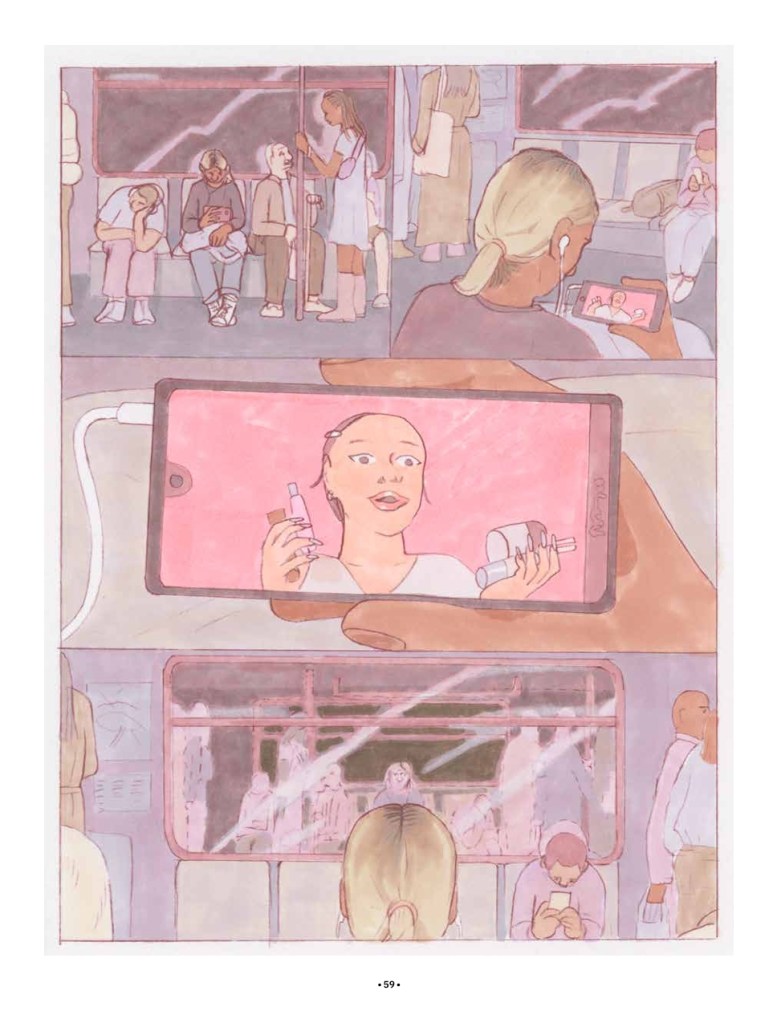 Comme Liv Strömquist dans son essai dessiné Dans le palais des miroirs, Lisa Blumen questionne dans sa fiction les représentations de la beauté à l’heure des réseaux sociaux et la marchandisation des corps dans un contexte où la sexualisation, l’image de soi et le désir sont devenus les arguments marketing clefs de la publicité, mais également ceux des créateur.ices de contenus. À travers son alter ego dédié aux soins du corps et au maquillage, Nina participe malgré elle à cette uniformisation de la beauté, à cette mise à distance de l’image de soi et aux injonctions socioculturelles.