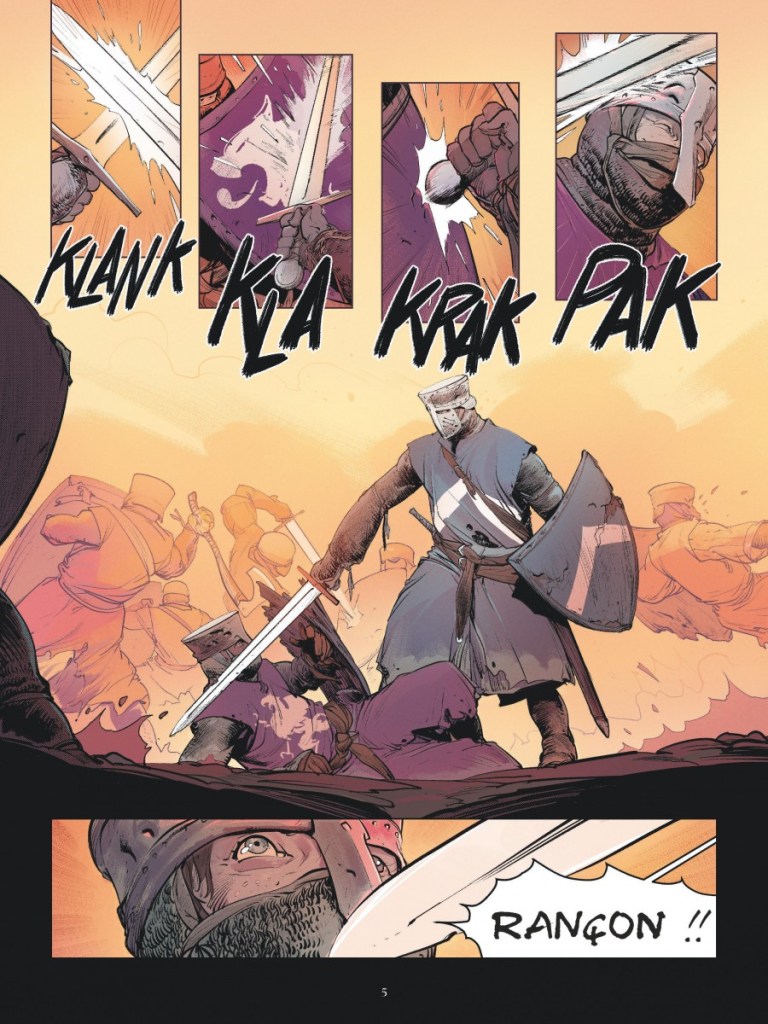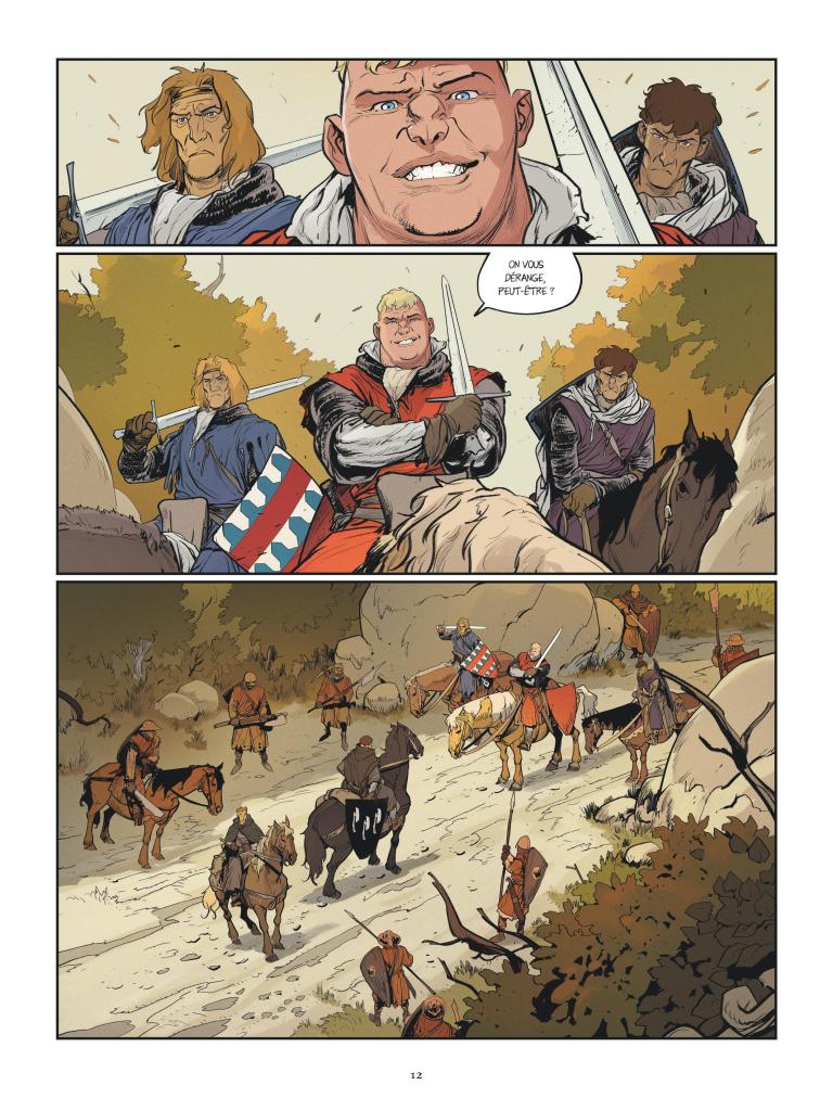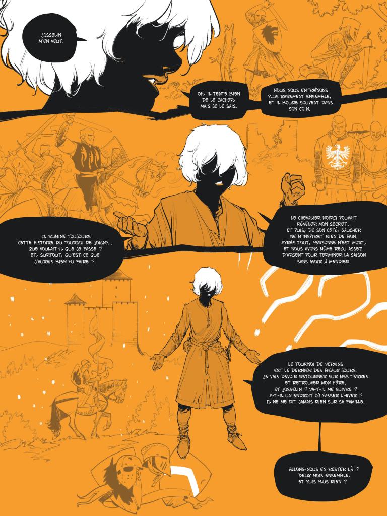 De plus, on est face à une bande dessinée remplie de personnages : aussi quand on a un doute sur qui est sous le masque, il suffit d’aviser le blason. À ce titre, le scénariste a très bien joué son coup dans les dialogues, en alternant l’usage des prénoms et des surnoms tirés de l’héraldique, ça active ce qui fait que ça crée la mémoire et l’on parvient ainsi à se rappeler de de l’identité des personnages.