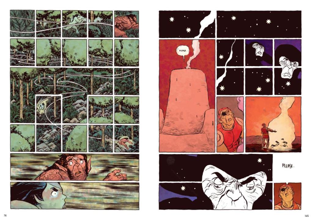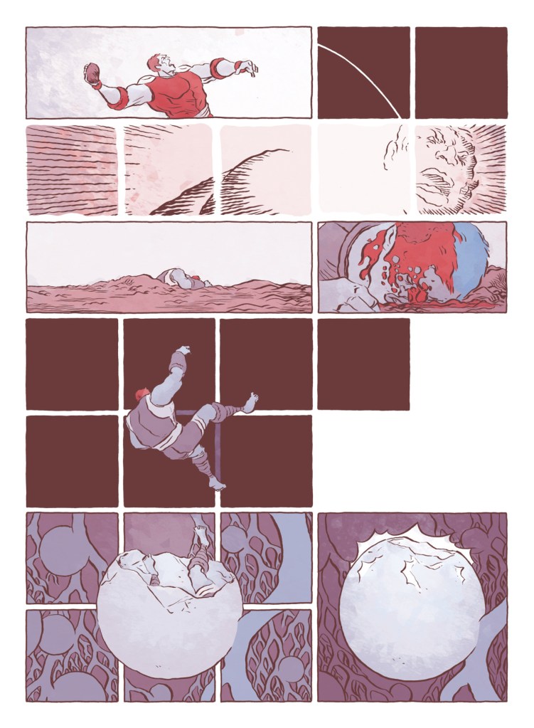 Pour son récit, le dessinateur à choisi d’utiliser peu de dialogues, de passer par des formes ou couleurs symboliques et d’offrir plusieurs sens à certains passages laissant aux lecteurices le soin d’interpréter l’œuvre. Des propositions ludiques qui rappellent les grands textes fondateurs —de l’épopée de Gilgamesh aux récits grecs des dieux de l’Olympe contre les Titans de Cronos— dont s’est inspiré Jesse Lonergan pour ce livre ; qui eux aussi, sont libres d’interprétation et évoluent fatalement selon leurs commentateurs —ne voyez dans ce coup de cœur que la mienne et reportez-vous au livre en cas de doute.