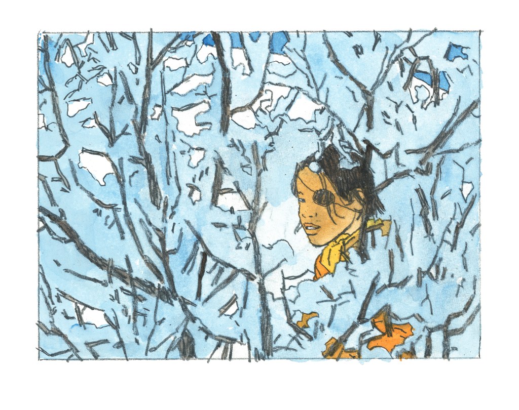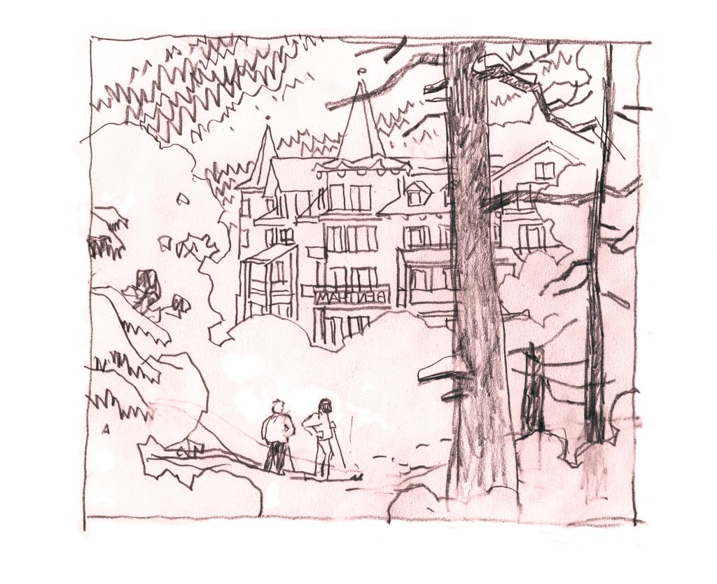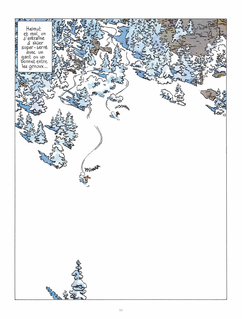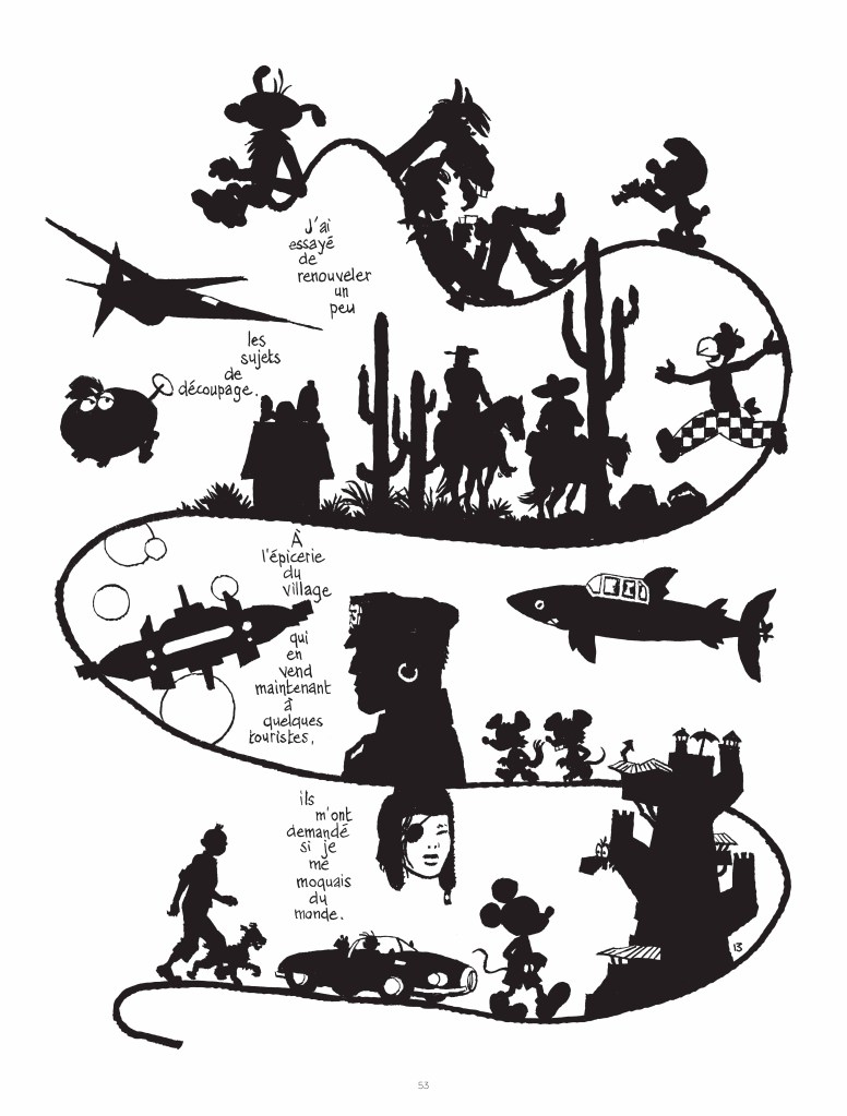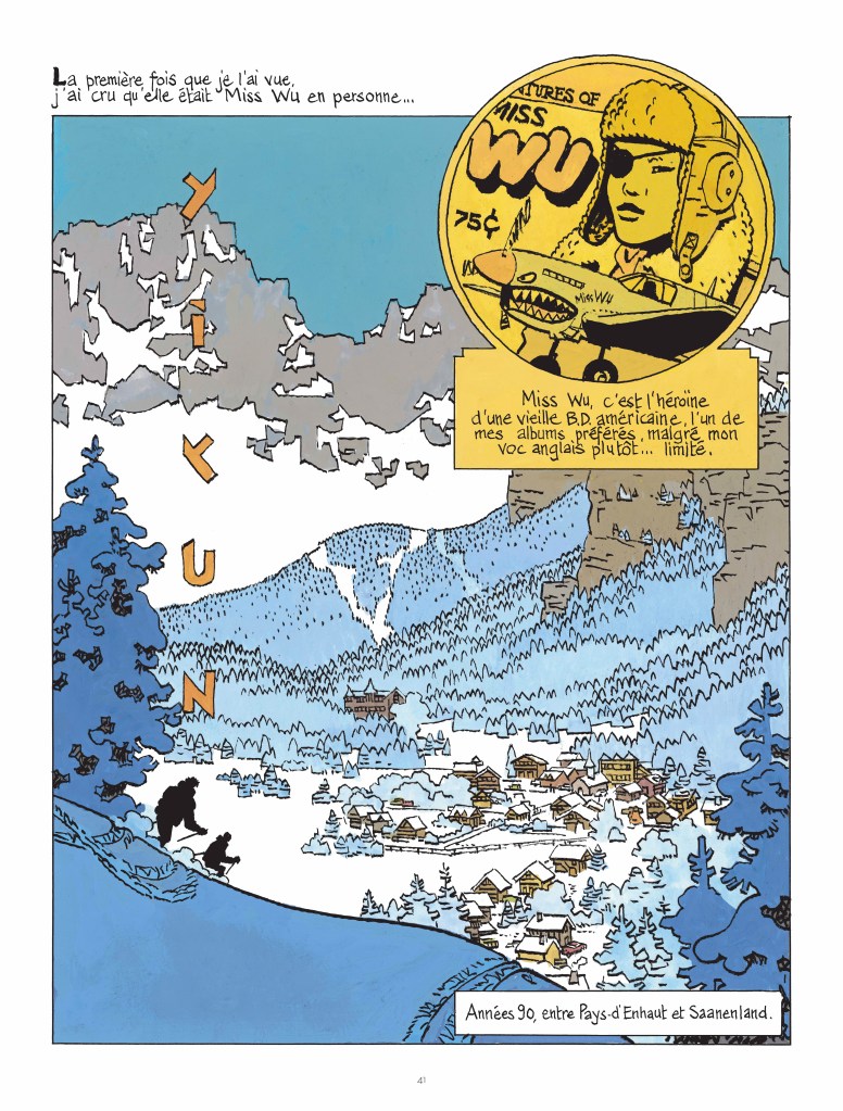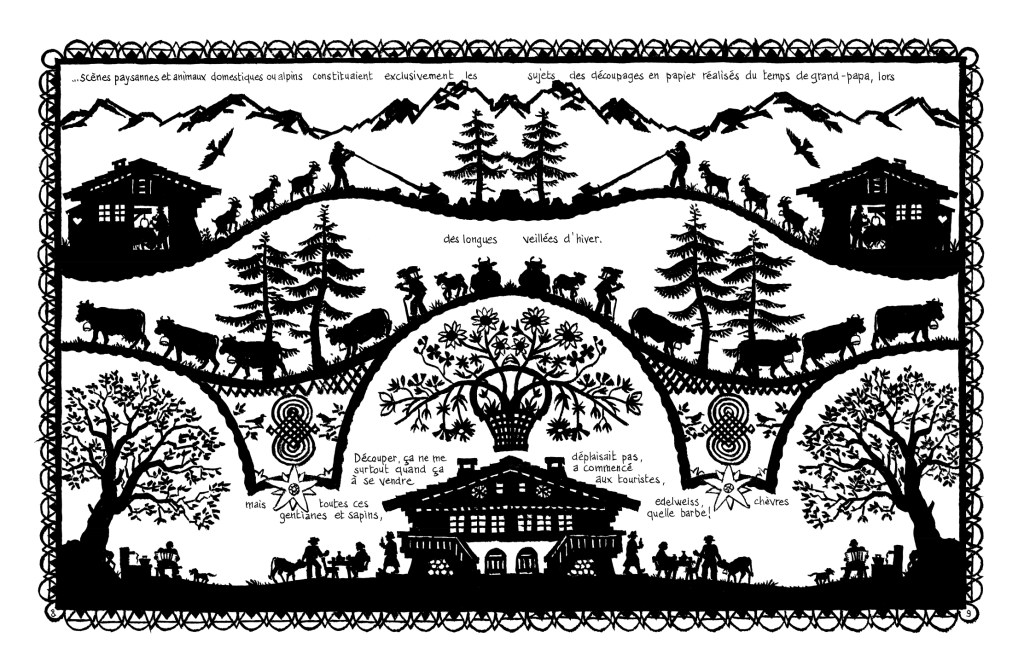 J’avais peur de me répéter, j’avais fait A la recherche de Peter Pan dans les Alpes valaisannes et j’avais envie d’avoir ces scènes d’ados qui skient en hiver en les transposant dans ce Pays-d’en-Haut. Et en parlant des découpages, ça me permettait d’avoir un personnage qui crée des images parce que j’aime bien parler de ce que je connais. Je ne peux pas parler de la vie d’un banquier ou d’un chimiste parce que je ne connais pas ces deux domaines alors que celui qui découpe, un peu comme l’auteur de bande dessinée, oui.