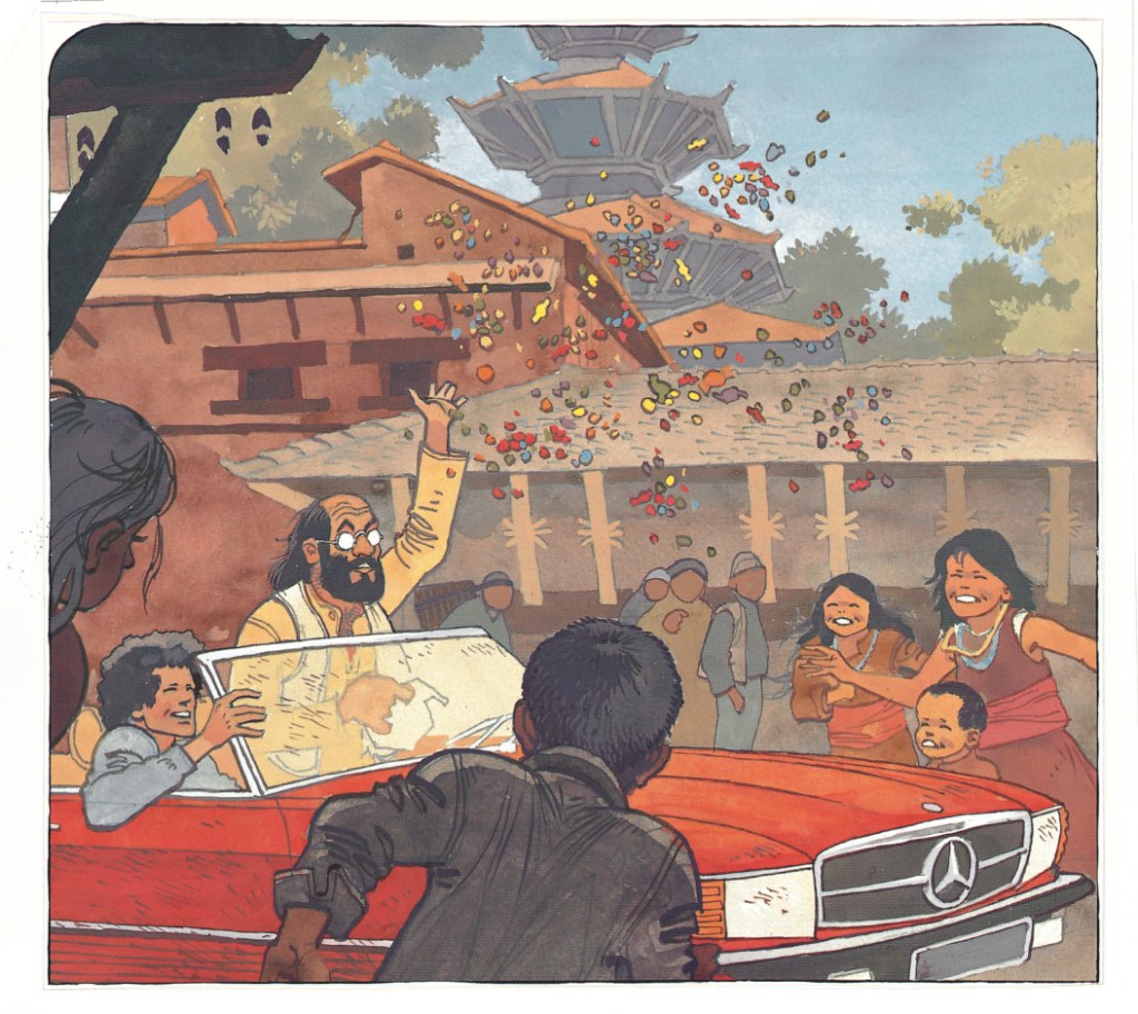 Cosey : Oui, réinterprétée dans un style de thangka. Avec l’idée d’un faire un mandala : un dessin symbolique traditionnel tibétain. Et je trouvais que la gamine qui bouffe une photo, c’était frappant. Ça m’a paru une bonne idée.