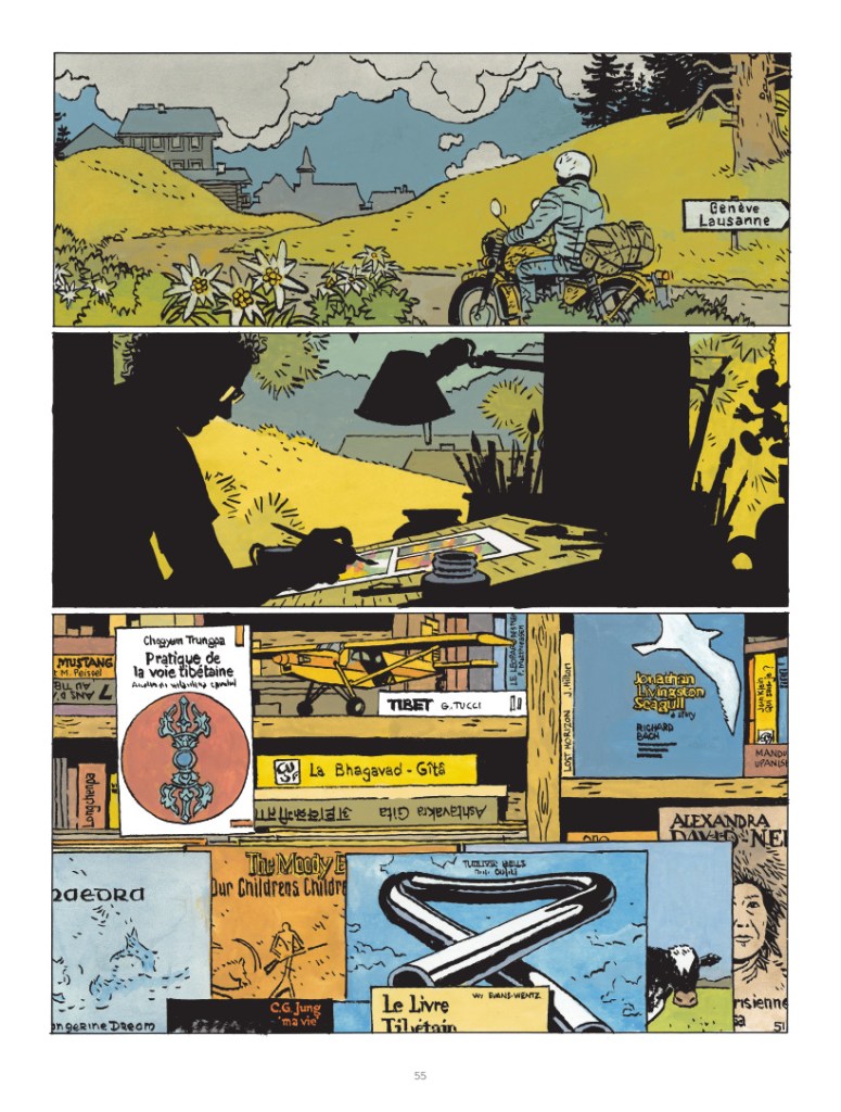 Cosey : L’inspiration, j’avais envie de développer cette espèce de divagation et je trouvais drôle de pousser le texte —alors que dans une bande dessinée il faut éviter d’avoir trop de texte— et d’aller à fond dans ce qu’on ne fait pas. Mais en prévenant le lecteur. Ça devient amusant, mais c’est aussi pour montrer que je suis conscient que je fais quelque chose qu’il ne faudrait pas faire, idéalement, dans un album.