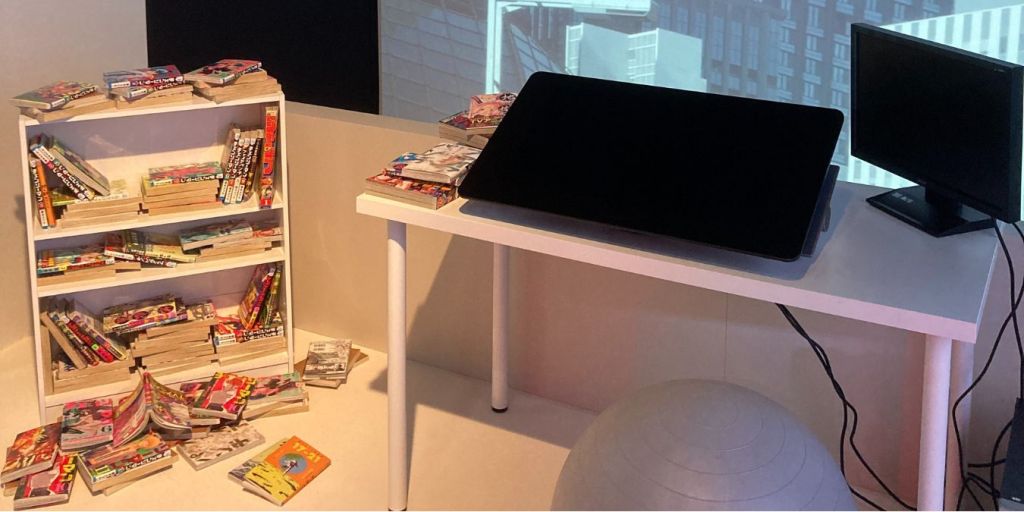 Image principale : bureau de mangaka reconstitué dans l’expo « Tatsuki Fujimoto, héros du chaos » à Angoulême, en 2022 / Photo ©Thomas Mourier