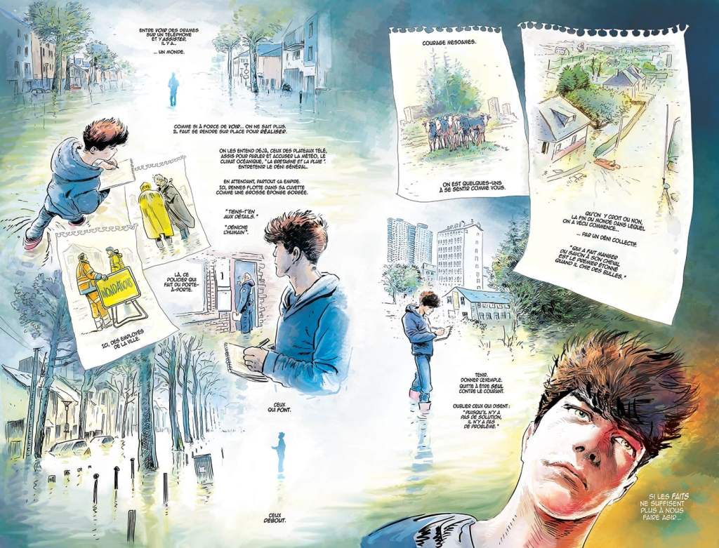 Pareil pour le dessin. Dans l’exemple que tu cites, le dessin doit être celui d’un jeune homme les pieds dans l’eau pendant des crues et qui se pose des questions sur le changement climatique. Alors le dessin de la séquence ressemble, en effet, à ce que serait son propre carnet. Comme si j’empruntais sa propre technique à lui (aquarelle, pinceau-feutre,) pour faire passer ce que lui ressent. Son dessin et lui-même ne sont qu’un. Pareil pour le lecteur et Pol.