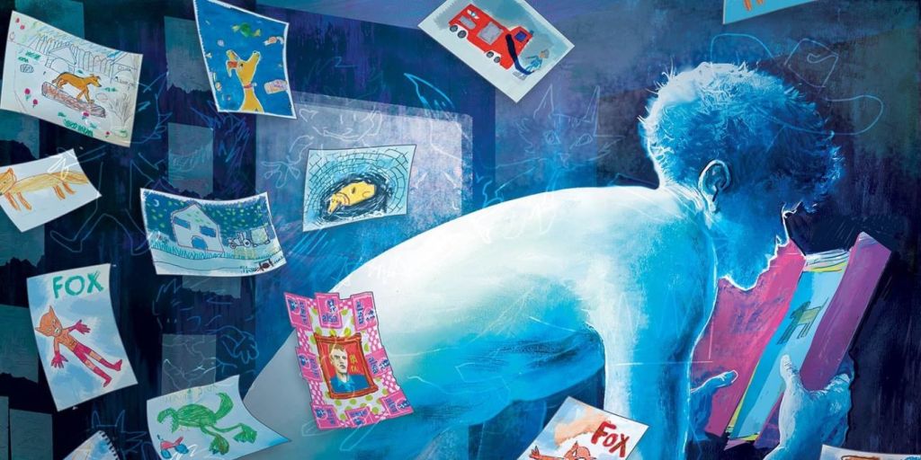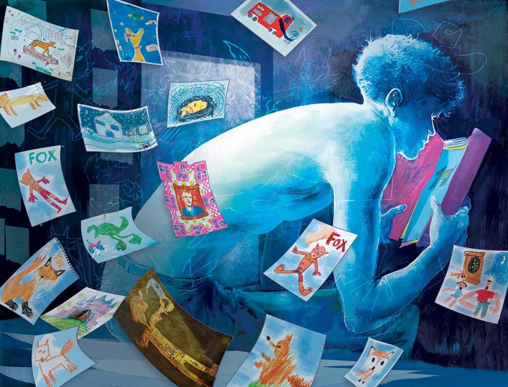 Quelques moments ont été faits en tradi, comme cette séquence où Pol ouvre le dossier avec ses dessins d’enfant. Cette double page a été faite en une heure peut-être, pour la base, puis j’y ai incrusté d’autres dessins. C’est comme ce que j’expliquais plus haut Ce sont des moments où la technique reflète l’intériorité du personnage. Comme la musique dans un film. Une tonalité bleue soutenue qui correspond au silence. On est au milieu de la nuit, il pleut, il n’y a pas de bruit. Pol a le cœur qui bat fort.