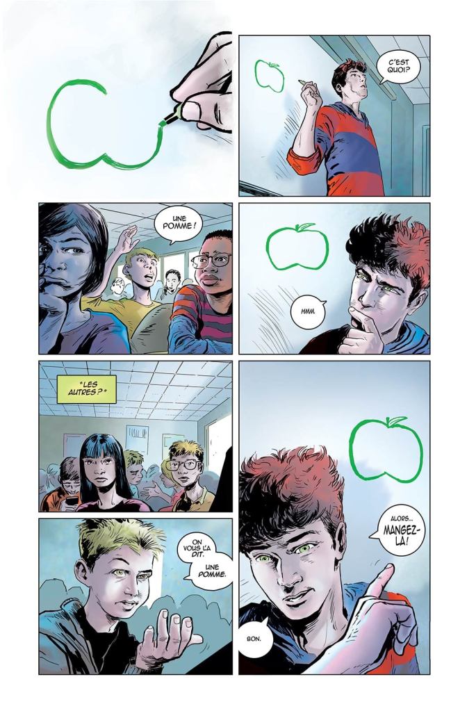 Ce n’est pas pour rien si à un moment, Pol retourne dans son ancien collège. Le vieux professeur que j’y ai dessiné est celui qui, 40 ans plus tôt, ouvrait le run d’Ann Nocenti sur Daredevil avec John Romita Junior et Al Williamson. Ce professeur, de toute évidence d’origine japonaise, essaie de sensibiliser les enfants à l’horreur d’un monde sous la menace de la bombe nucléaire.