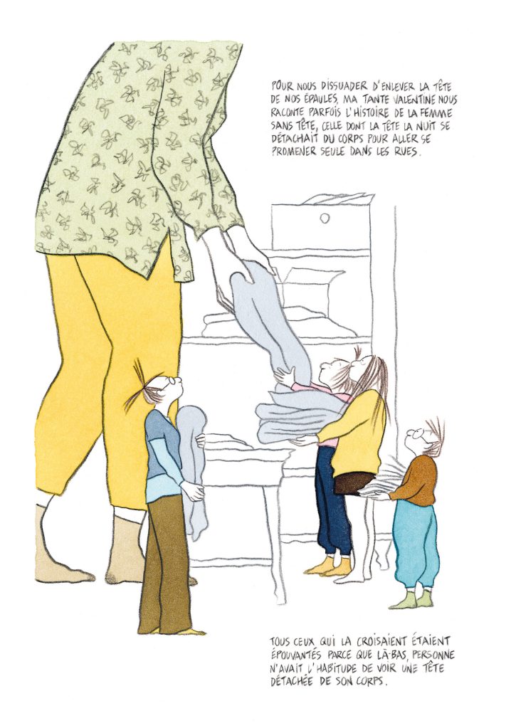 Quand les mots ne suffisent plus, ne peuvent pas être convoqués, le corps parle et la dessinatrice joue sur ces interprétations. Le langage de « la Grosse Tête » est d’ailleurs plastique, symbolique lui aussi. En parallèle, une scène où toute la bande est devant la télé et regarde La Belle et la Bête de Jean Cocteau prend une dimension particulière avec les scènes du film qui s’impriment dans les corps détournés, donnant un éclairage particulier à ce film qui parle de sexualité et secrets. Ou encore le conte aztèque raconté par la grand-mère, les armoires qui renferment les secrets de famille… Ce ne sont que quelques exemples tant cet album est riche d’inventivité.