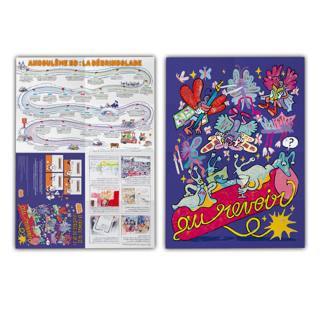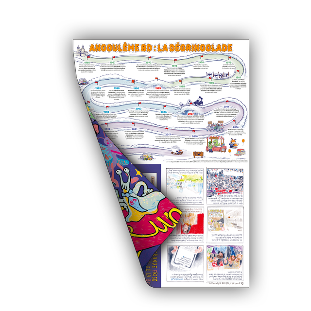 Ça se présente comme un petit magazine dépliant avec, au début, une première création qui est une BD inédite de tienstiens sur le girlcott. Derrière, on a fait une grande frise illustrée de la dégringolade d’Angoulême pour expliquer un peu tout l’historique. Parce que ça s’étale sur des années et des années depuis le début.