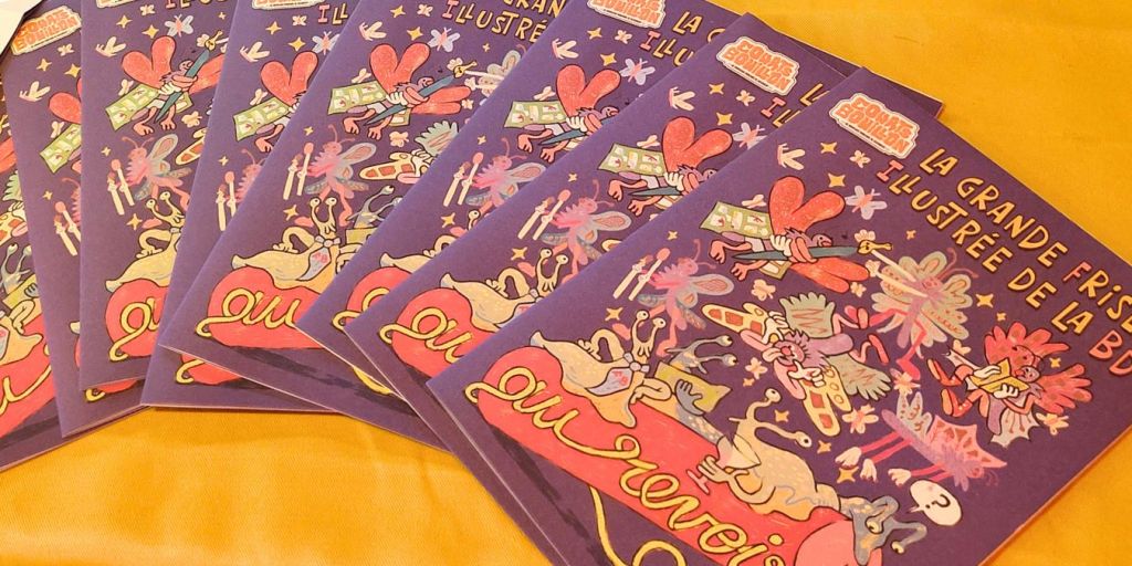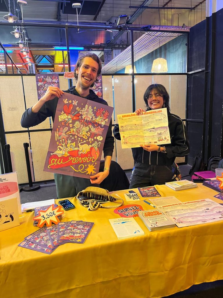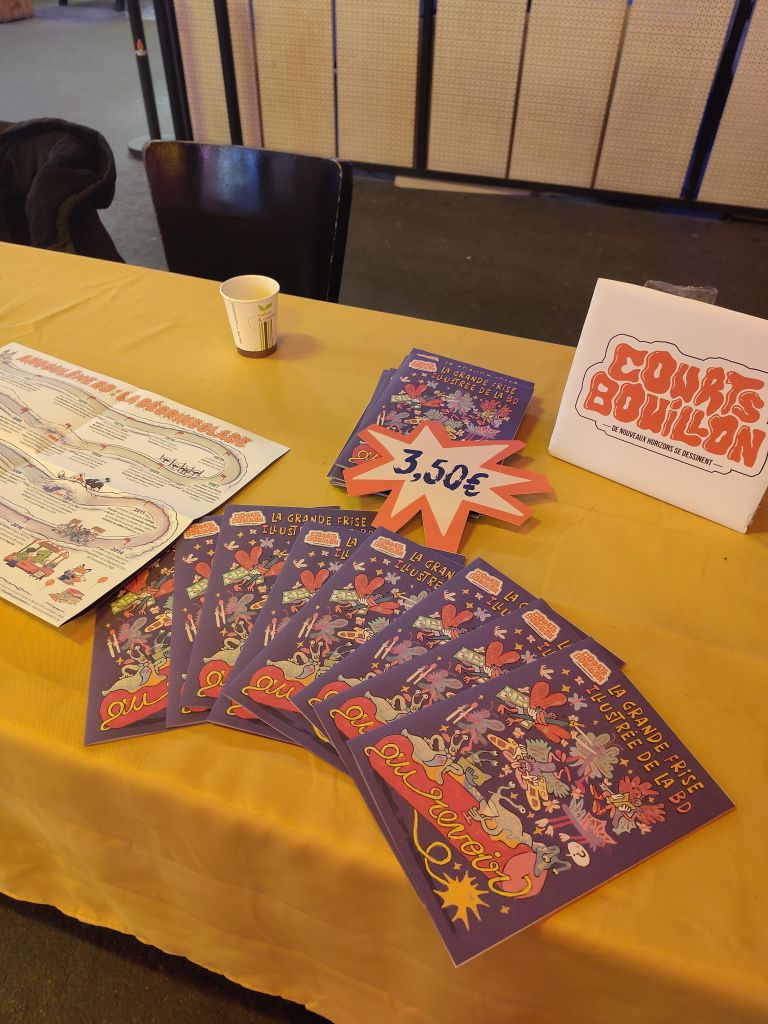 À Ground Control, pour les Fêtes interconnectées de la BD, Courts Bouillon avait un stand avec une publication, une frise illustrée sur l’histoire d’Angoulême assortie de créations originales dans un format dépliant.