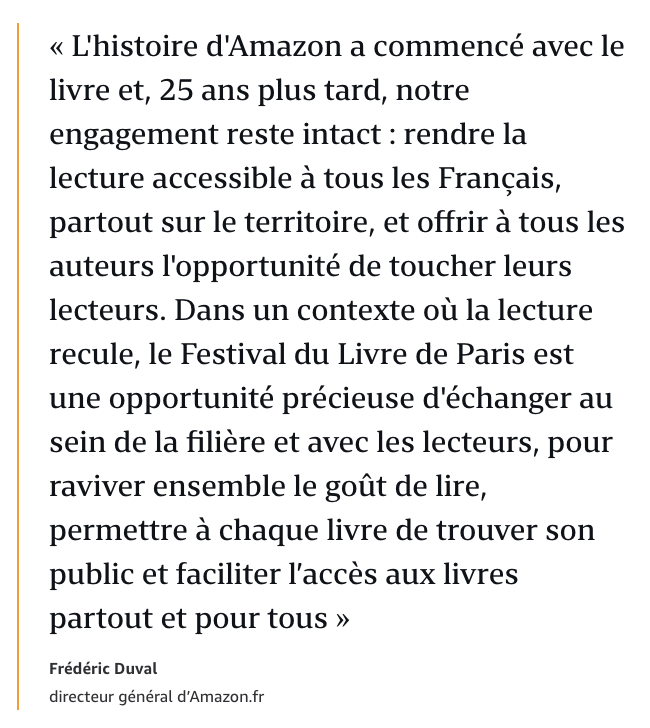 Pour éviter de contribuer à cette polémique absurde, Amazon a décidé, d’un commun accord avec le Festival du Livre de Paris, de se retirer de cette édition. Dans un pays où plus de 90% des communes n’ont pas de librairies, la lecture ne devrait pas être instrumentalisée mais devrait au contraire rassembler tous les acteurs de la filière au service de tous les lecteurs, qu’ils résident en ville ou en zone rurale. Soutenir la lecture pour tous n’a jamais été aussi important, et Amazon reste pleinement mobilisée en ce sens.» (source)