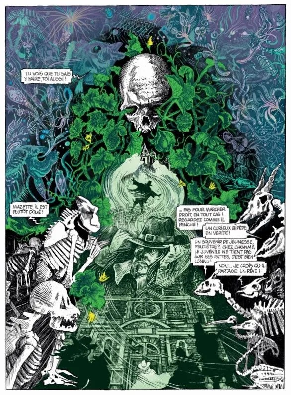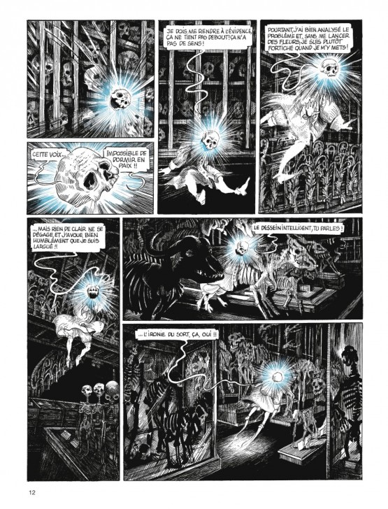 Si dans ses travaux précédents, la faune & la flore étaient aussi à l’honneur, cette collaboration avec Muséum d’histoire naturelle à Paris lui a permis de dessiner et mettre en scène un bestiaire nouveau fait de curiosités, de détails et de clins d’œil. Les planches sont chargées de détails, de références et de symboliques sans jamais prendre toute la place. La dessinatrice balance entre l’effet cabinet de curiosités et les pleines pages très graphiques tout en gardant le crâne comme fil rouge.